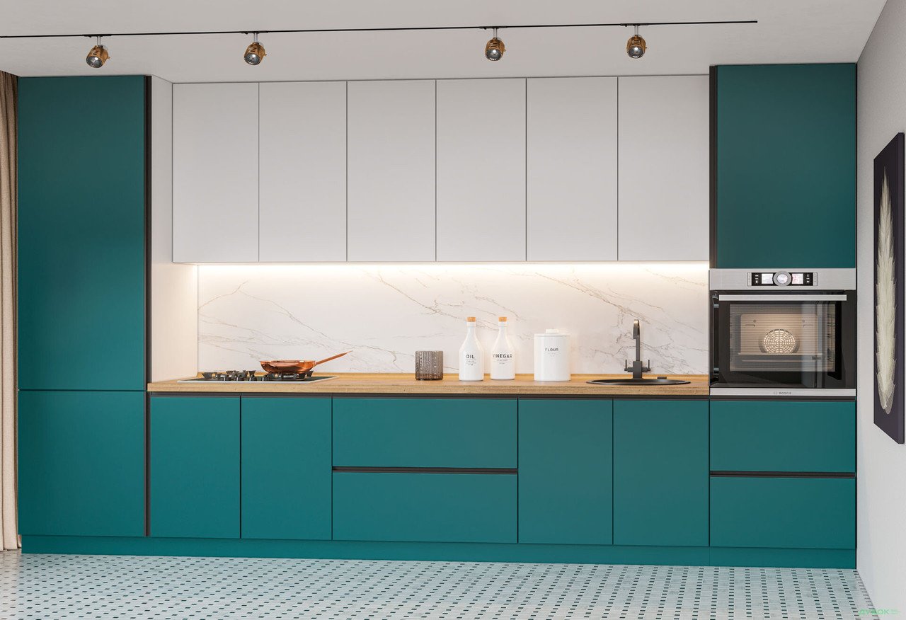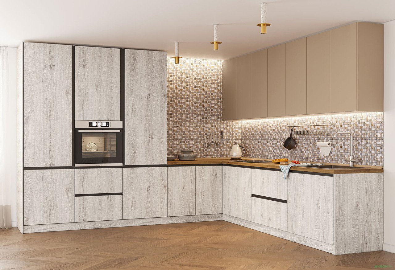 Кухня виготовлена з високоякісних матеріалів: корпус кухні та фасади виготовлені з ДСП з підвищеною стійкістю до вологи та температур.