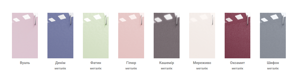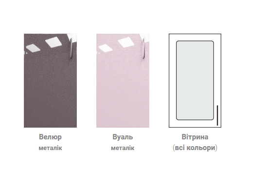 Корпус меблів виготовляється з ламінованого ДСП Swisspan, фасади – з високоякісної фарбованої МДФ. Вітрини комплектуються рамою кольору металік.